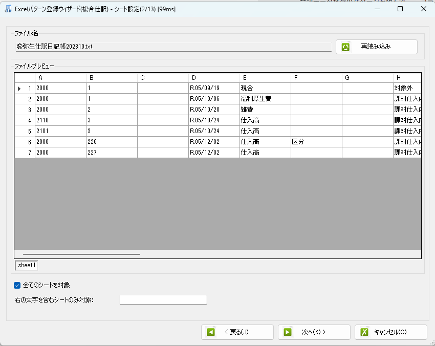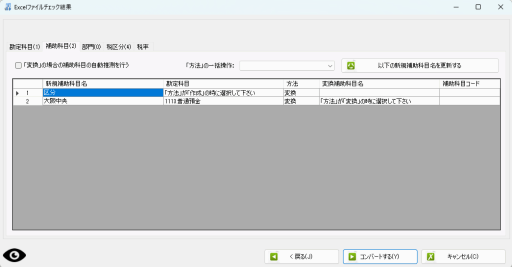2行目は、大阪中央という補助科目の文字列(この場合は弥生会計の補助科目)を取り込んだけれども、