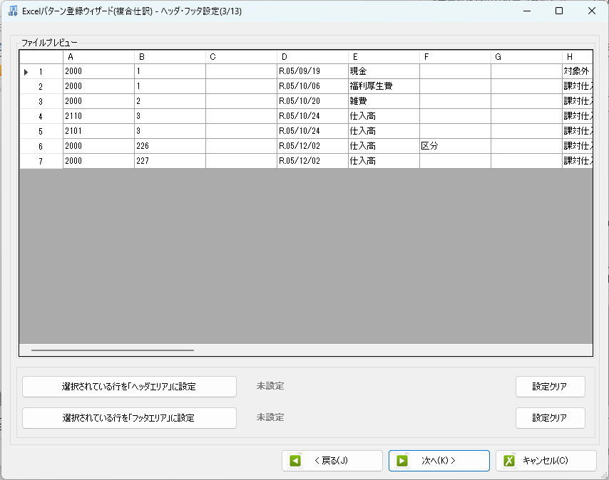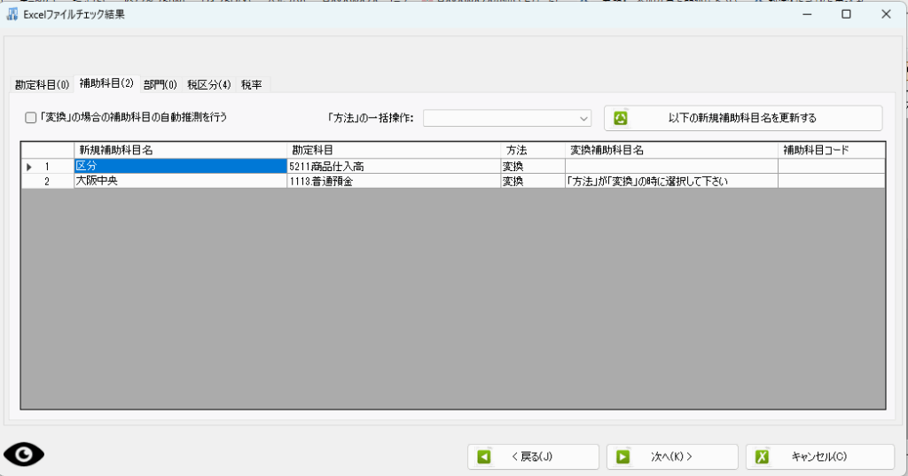 1行目に至っては、区分という補助科目を取り込んだけれども勘定科目も不明だよという状態になっています。