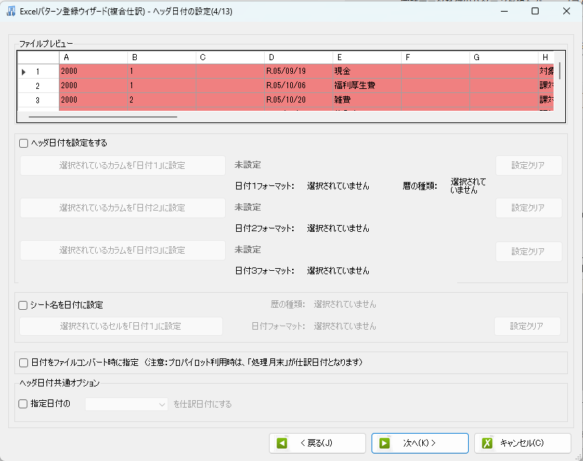 ヘッダ行がないので、ヘッダ日付の設定もスルーでOK! 次へで進みます。