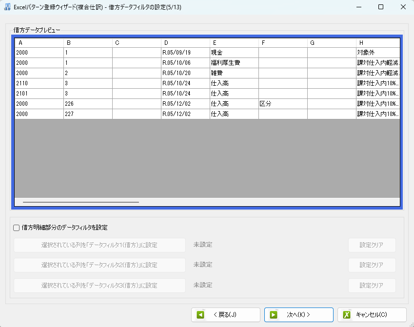 借方データフィルタの設定画面です。
