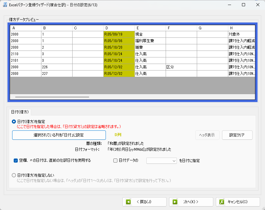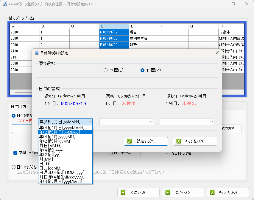 今回は、和暦のデータなので、詳細設定でも和暦年(2桁)月日(yyMMdd)を選択します。