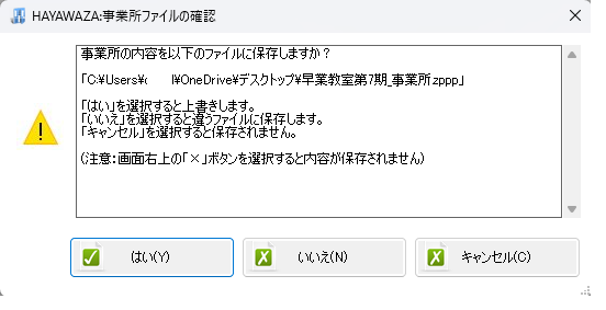 ファイルから開いた事業所は、作業を終えて、事業所やHAYAWAZAを閉じようとすると、