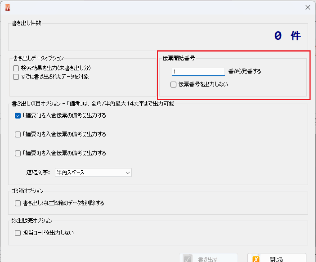 インポート前に、弥生販売上での最終伝票番号を確認し、重ならない番号をスタート値として指定した上で書き出しを行ってください。