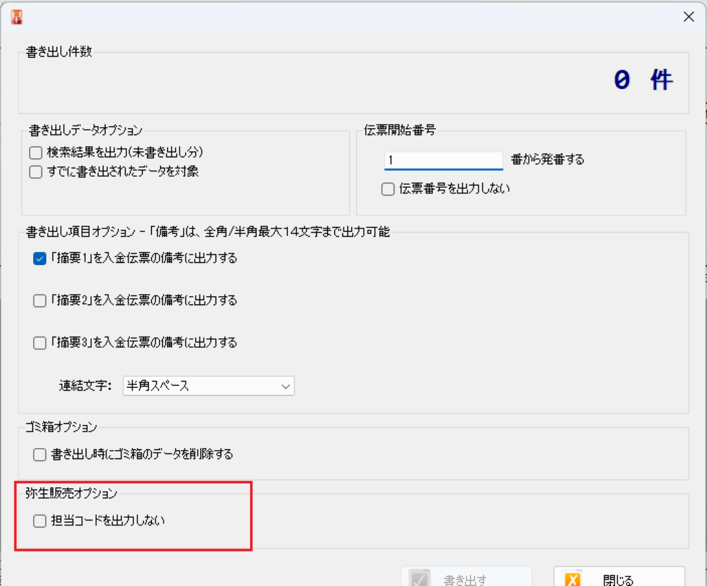 書き出し画面の「弥生販売オプション」にある「担当者コードを出力しない」にチェックを入れて