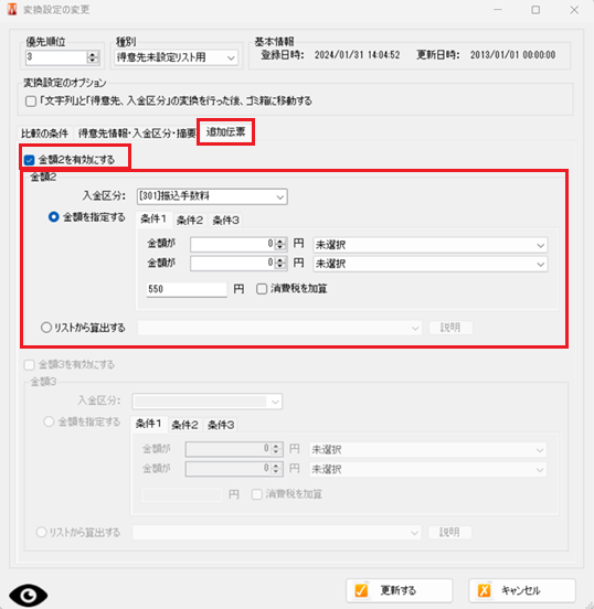 3. 追加伝票のタブを開き、「金額2を有効にする」にチェックを入れ、「入金区分」「金額」を指定する