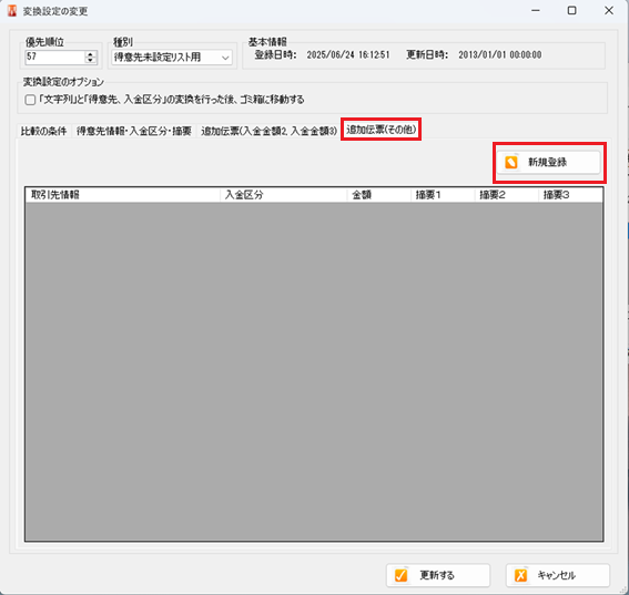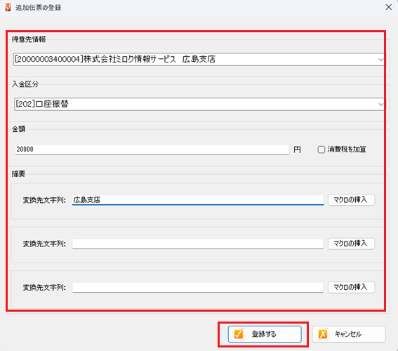 4. 追加伝票登録画面で、得意先、入金区分金額などを設定する
