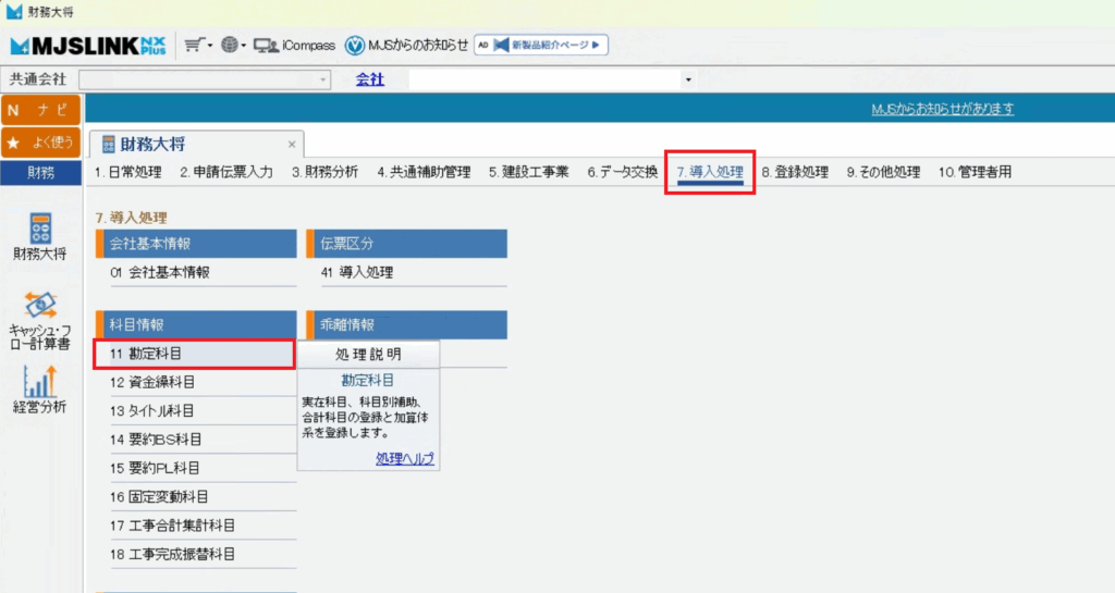 「導入処理」>「勘定科目」と進みます。