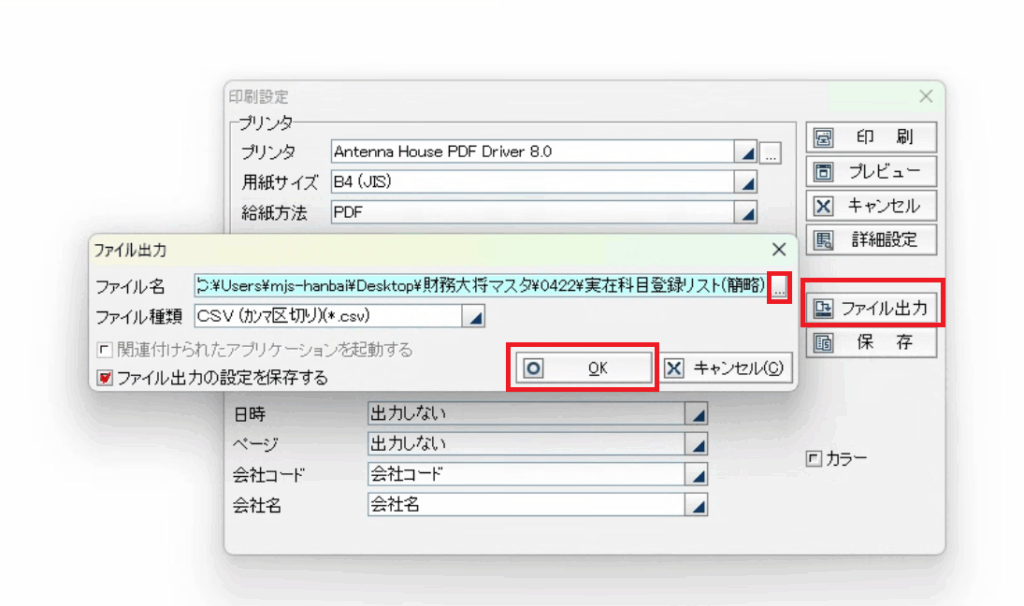 「ファイル出力」をクリックして、「ファイル名」の横にある「…」より、フォルダ・ファイル名を指定し、「OK」をクリックして出力をしてください。
