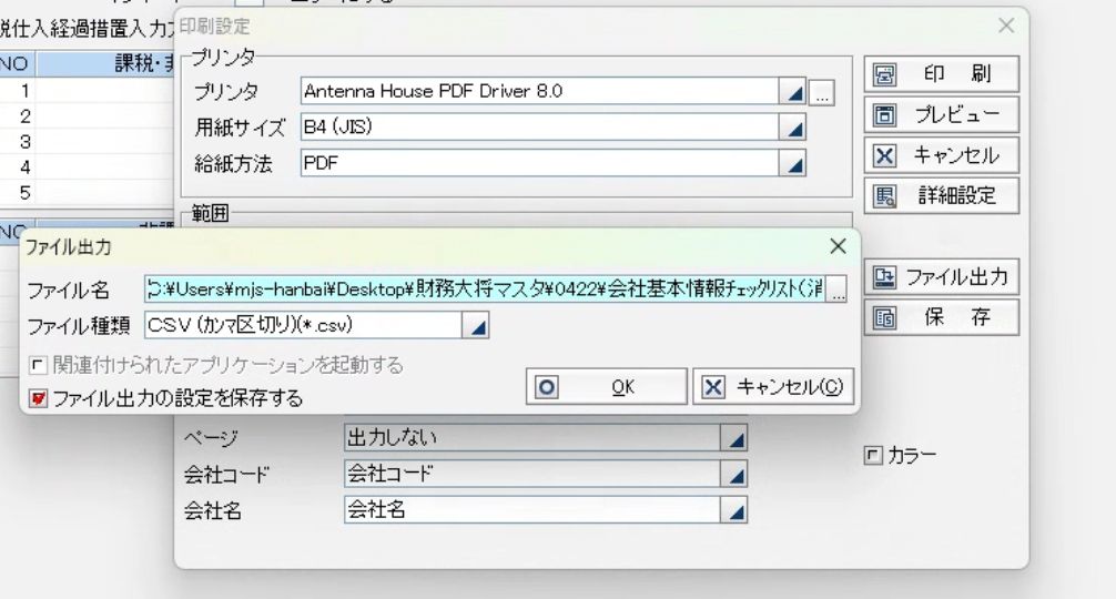 印刷設定画面で、「ファイル出力」をクリックし、フォルダ・ファイル名を指定して、「OK」をクリックしてください。