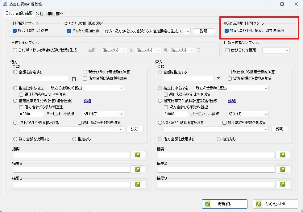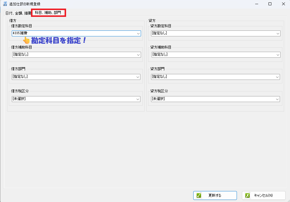 かんたん追加仕訳では、科目が自動的に設定されます。