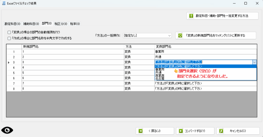 ・コンバート時のマッチング、部門の処理で、変換を選択した際に、部門未選択(空白)が選択できるようになりました。